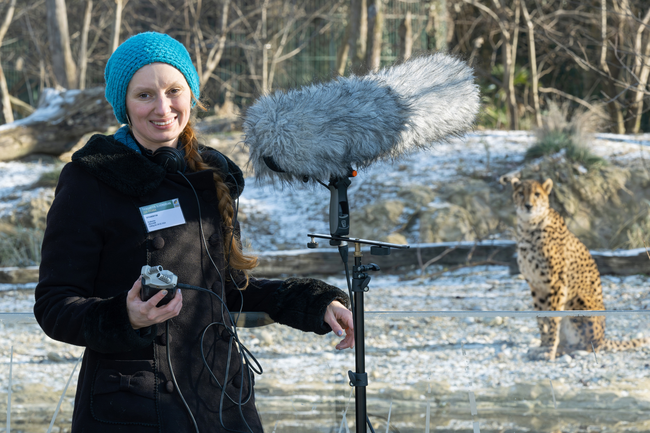 Katharina Prager, Doktorandin im Fachbereich Biologie des Instituts für Schallforschung an der Österreichischen Akademie der Wissenschaften, erforscht die akustische Kommunikation der Katzen. Dafür nimmt sie deren Laute mit speziellen Geräten auf. Bevor es in die afrikanische Savanne geht, übt Prager vorerst mit den Schönbrunner Geparden.